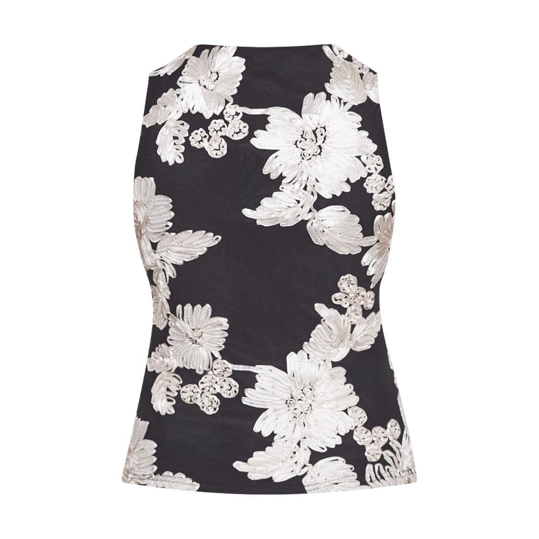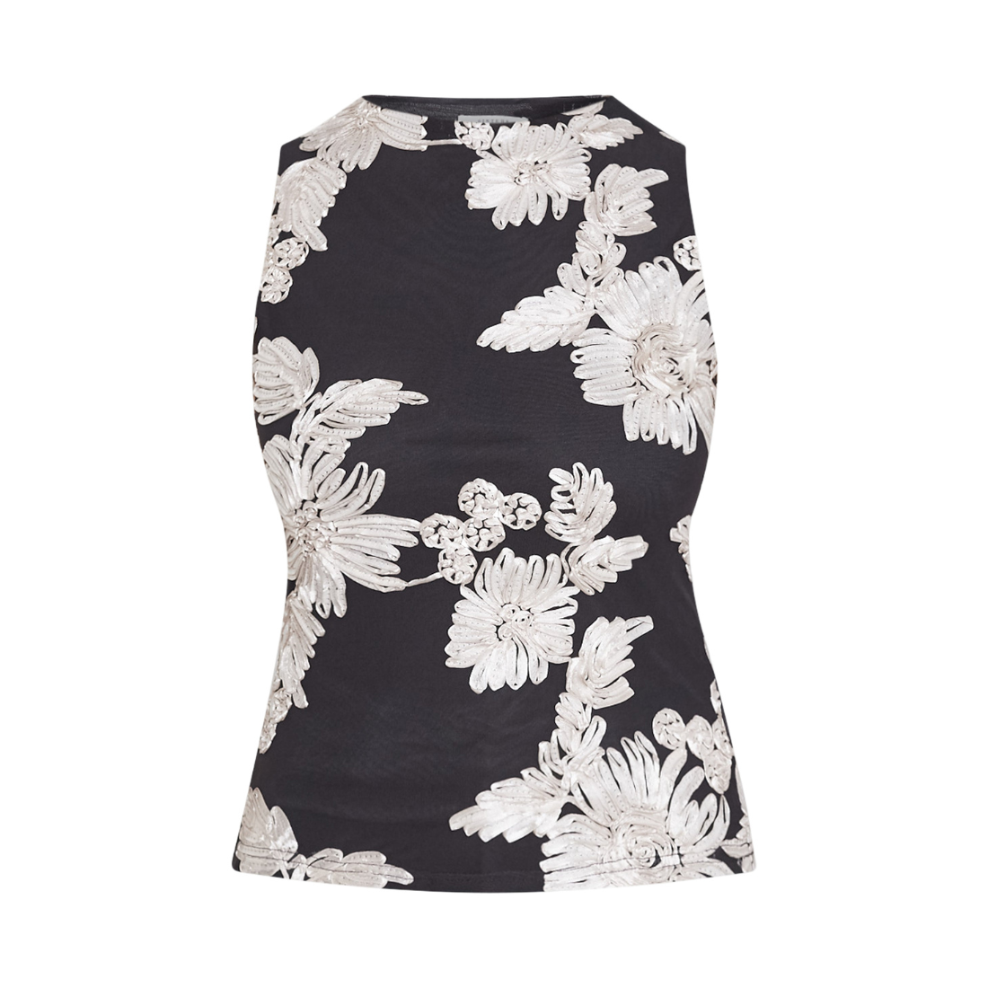 SIS-TOP har korta ärmar, dekorerad med vackra, broderade blommotiv. Den har en rund, åtsittande halsringning.