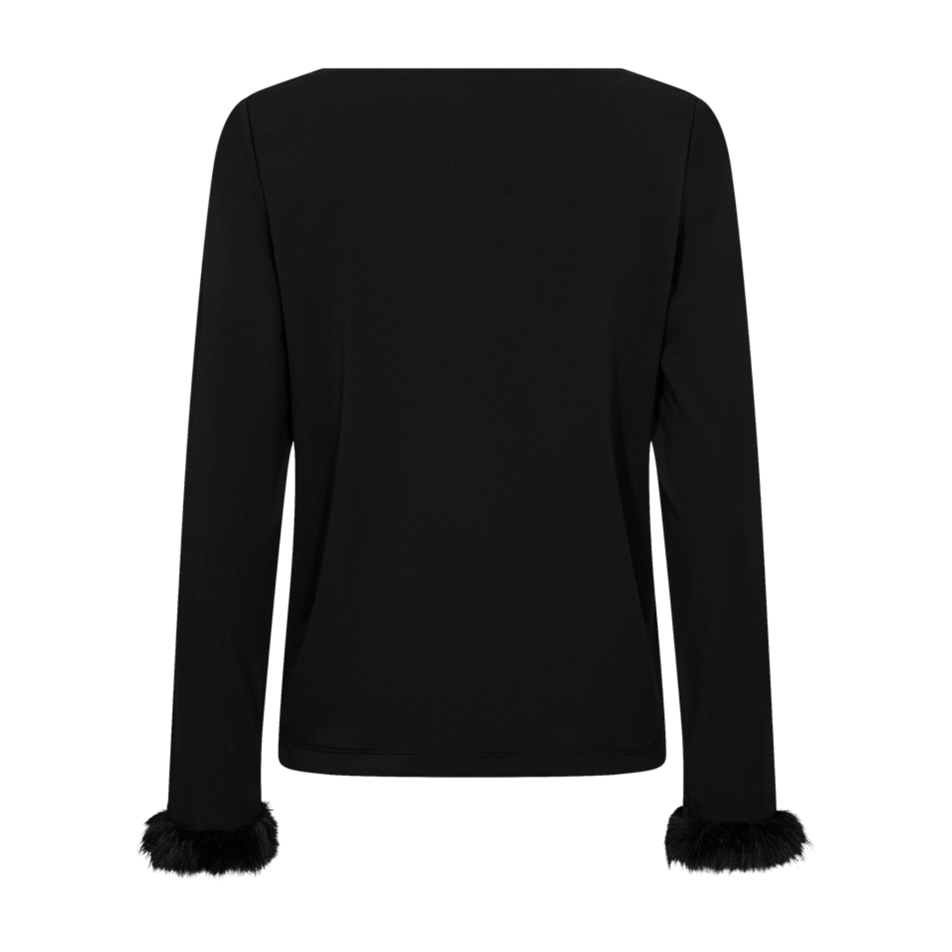 Elegant svart festtopp med lyxiga pälsmanschetter. En svart, långärmad topp med rund halsringning och fina pälsdetaljer vid ärmarna som ger en extra sofistikerad touch till outfiten.