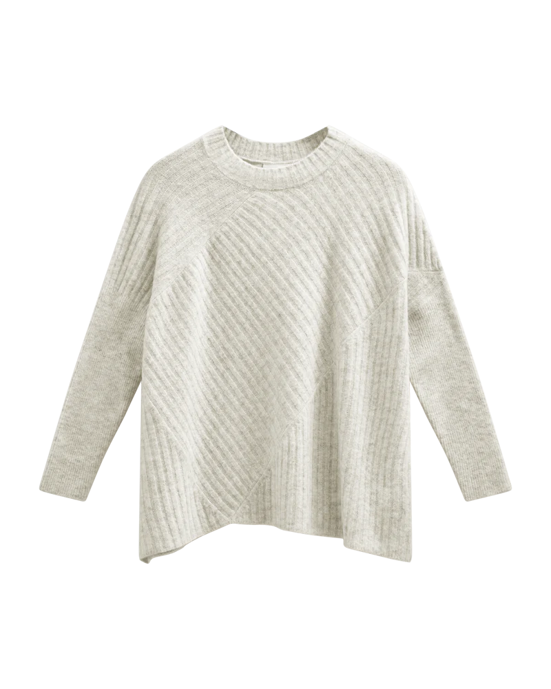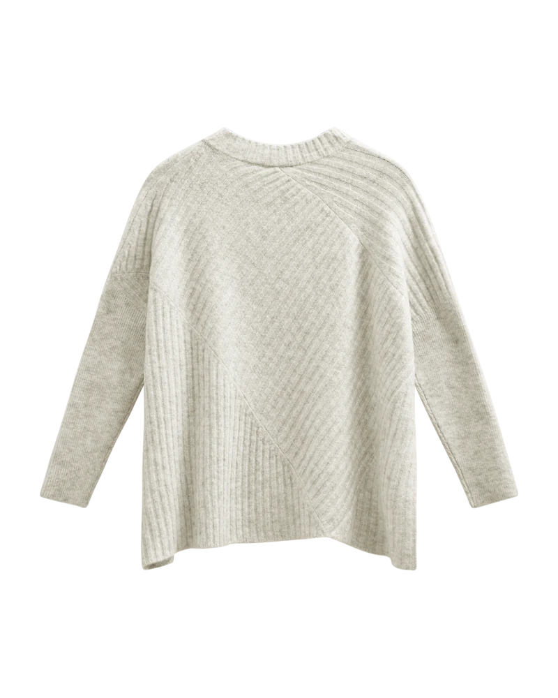 Tröja från Freequent i ribbat material med asymmetrisk skärning. Tröjan har en enkel silhuett med smala, långa ärmar, ribbad krage och en elegant, lös passform.