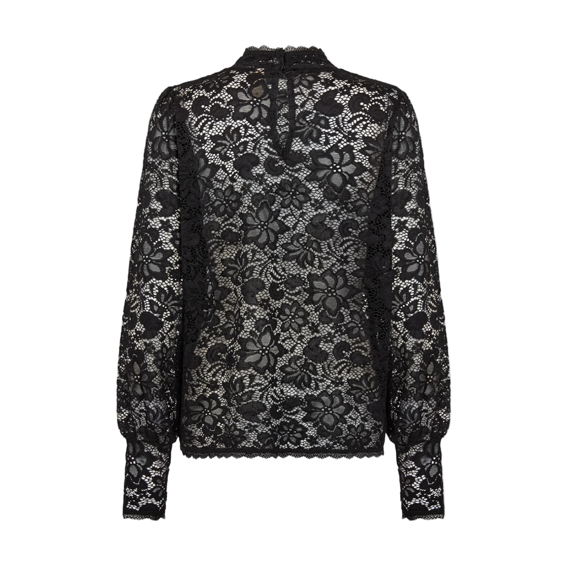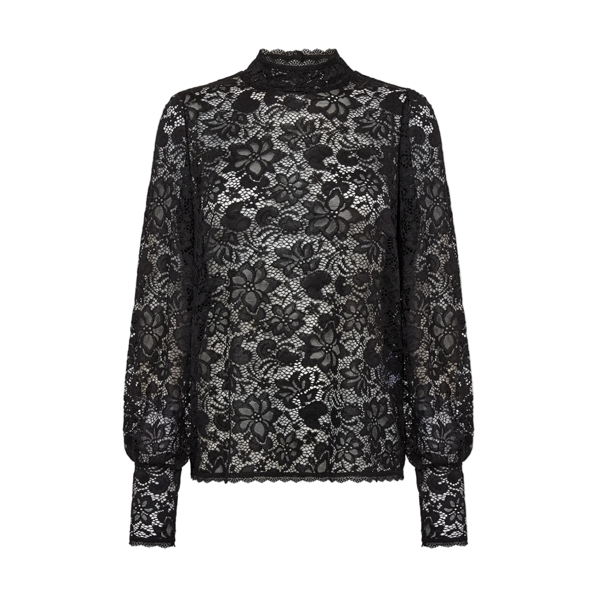 Denna blus från Soya Concept har en elegant spetsdesign med hög halsringning och långa ärmar, vilket ger en touch av stil. Matcha blusen med skräddarsydda byxor för en elegant look eller med jeans för en mer avslappnad look.